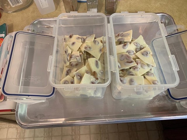 I always line the cooky sheets with foil as it makes it much easier to break the bark apart once it is hardened.